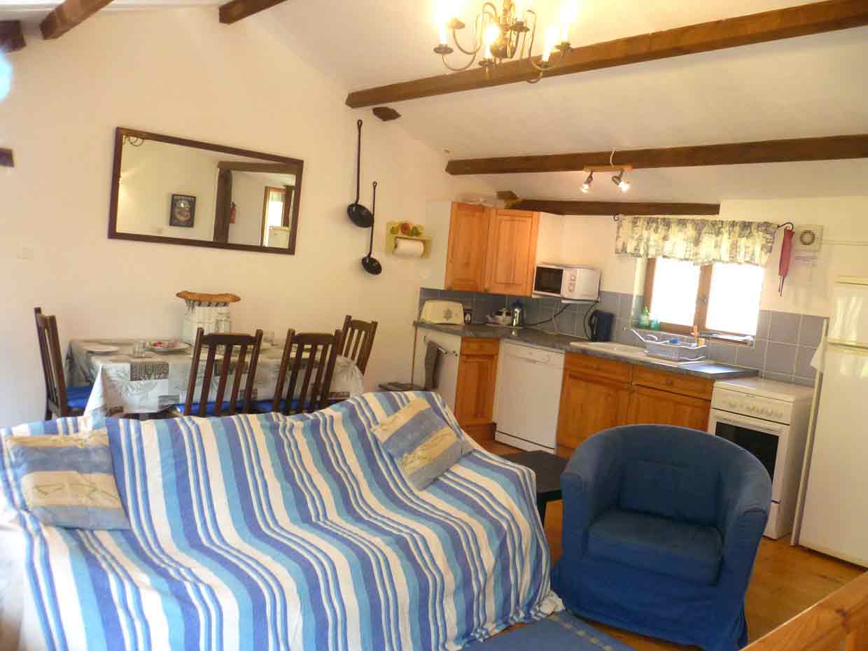 Spacious open-plan, well-equipped kitchen area with views over the fields to the rear of the Gite and with the sitting room/dining area at the front, enjoying marvellous views over the woods and surrounding countryside. La Roche is well equipped with Gas Cooker, Fridge-Freezer, Microwave,Dishwasher, TV (French Free TV incl Disney+, Canal+, Netfllix), CD player and DVD player with a selection of DVDs, books and games. Stairgate at top of stairs.