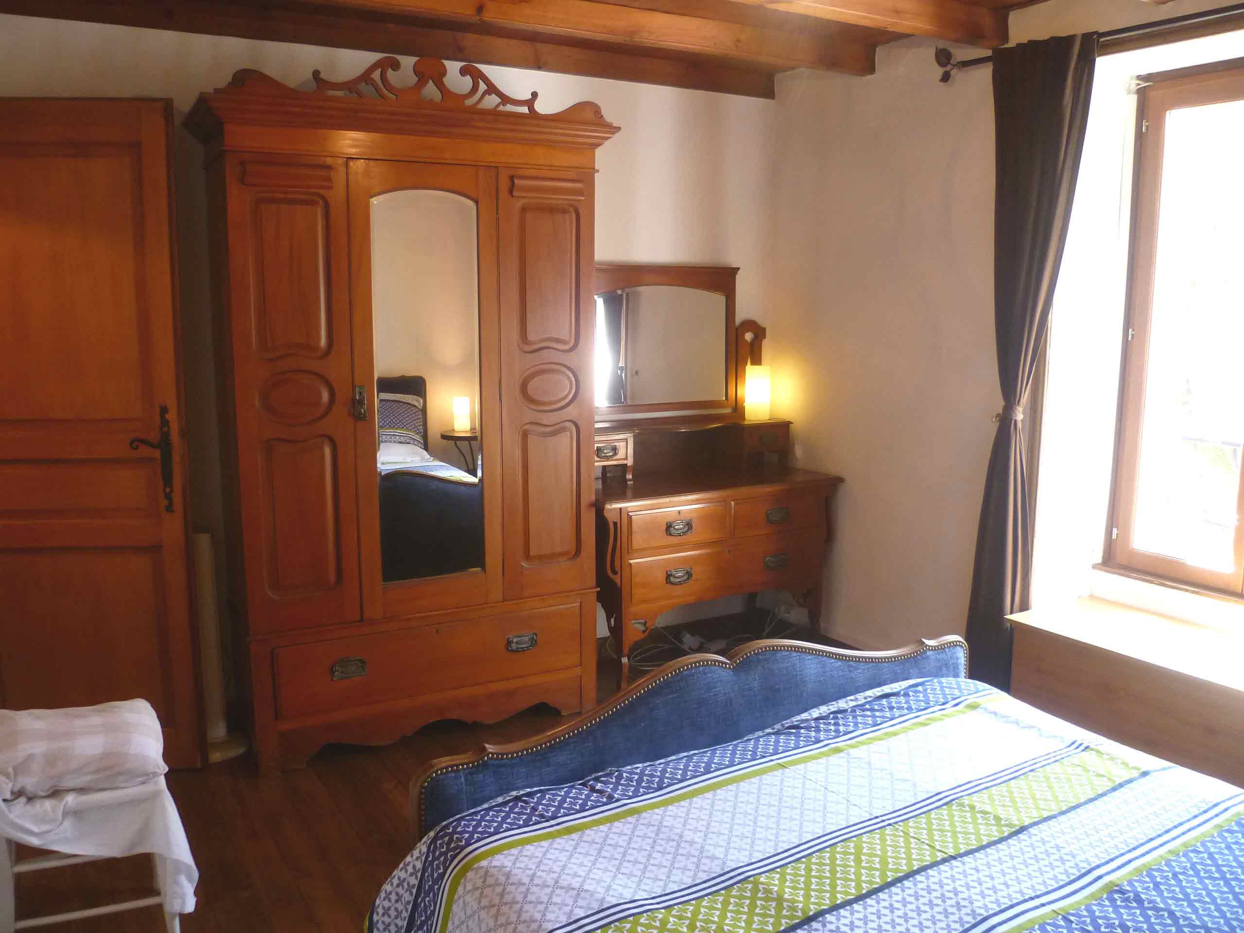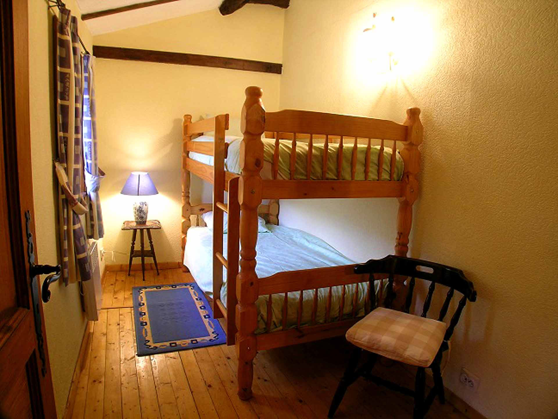 From entrance Hall stairs - 1 double wood-panelled bedroom (Antique French bed 190x140) with original Oak beams with lovely views over the Woods. Second bedroom overlooking our wildflower area at the rear of the property. Bunk beds. Shower room with WC, washbasin , heated towel rail and shaver socket.