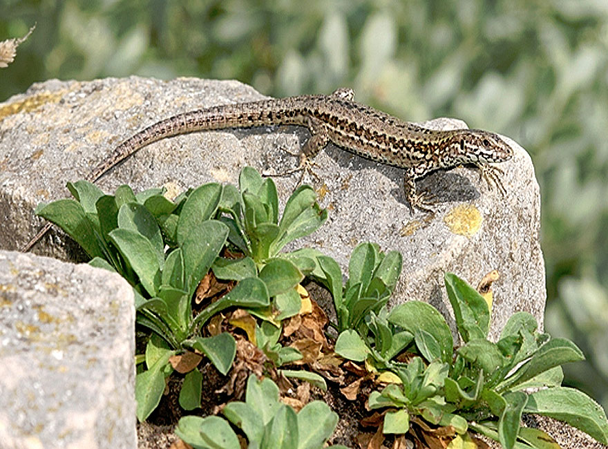 Lizards bathe in the glorious sunshine on walls and stones.